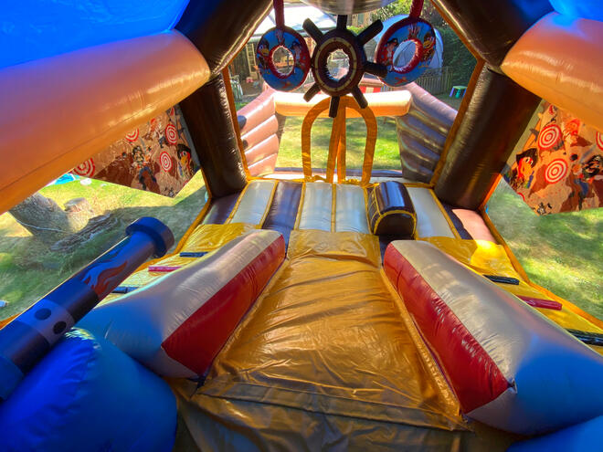 Schip ahoy !Het indrukwekkende grote springkasteel in de vorm van een piratenschip is een spectaculaire attractie voor kinderen van alle leeftijden. Met een opblaasbare buitenkant die eruitziet als een levensecht piratenschip, zullen kinderen meteen enthousiast worden over het avontuur dat hen te wachten staat.Binnenin bevindt zich een opwindende wereld van plezier en verbeelding. Kinderen kunnen deelnemen aan een piratenavontuur waarbij ze kunnen schieten met ballen naar doelwitten met behulp van de 2 kanonnen. Dit voegt een speelse interactieve dimensie toe aan het springkasteel.
