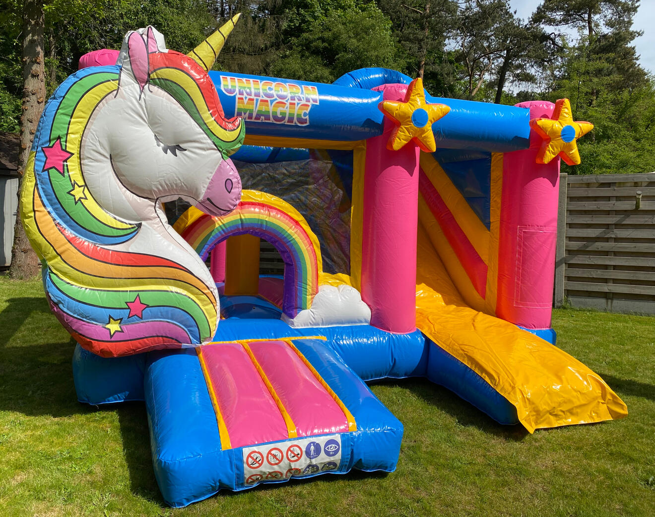 Het is versierd met levendige kleuren, een mooie eenhoorn en regenbogen en heeft opblaasbare pilaren en een glijbaan. Hierdoor kunnen de kinderen veilig springen en spelen.