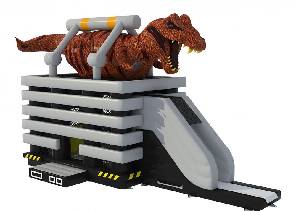 Deze gigantische opblaasbare glijbaan met een brullende rode dinosaurus bovenop zorgt voor uren speelplezier en avontuur!Betreed de kooi via de ingang aan de zijkant, waar je uitdagende opblaasbare obstakels zult tegenkomen.