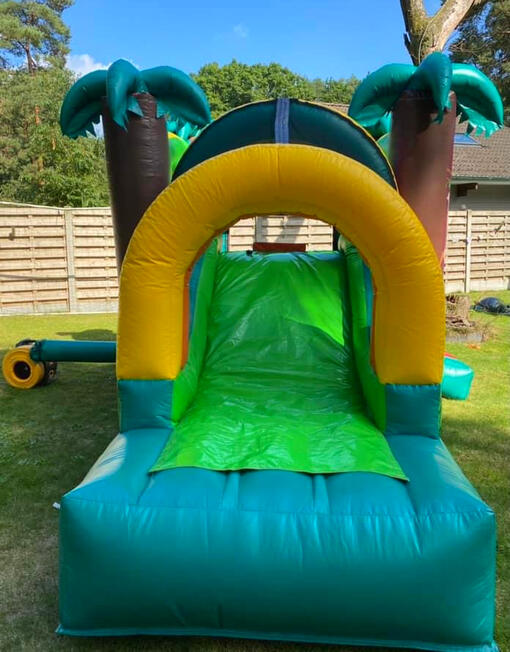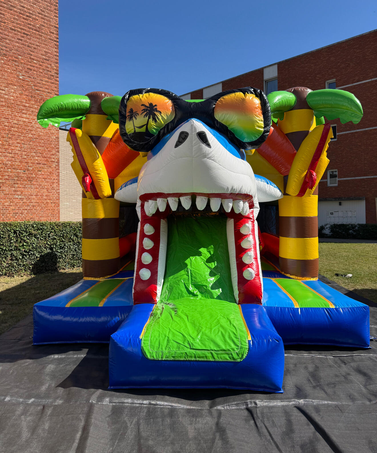 Dit kleurrijke springkasteel met tropische palmbomen, een glijbaan en leuke obstakels binnenin, zorgt gegarandeerd voor urenlang springplezier!Het vrolijke haaienontwerp met zijn cool zonnebril maakt dit springkasteel een echte blikvanger.