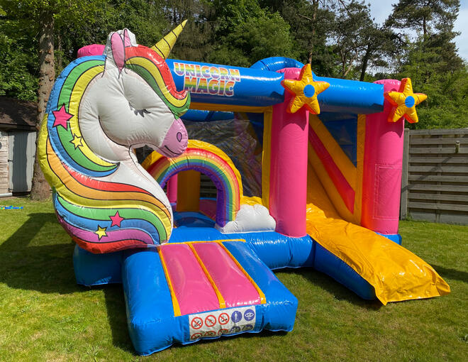 Het is versierd met levendige kleuren, een mooie eenhoorn en regenbogen en heeft opblaasbare pilaren en een glijbaan. Hierdoor kunnen de kinderen veilig springen en spelen.