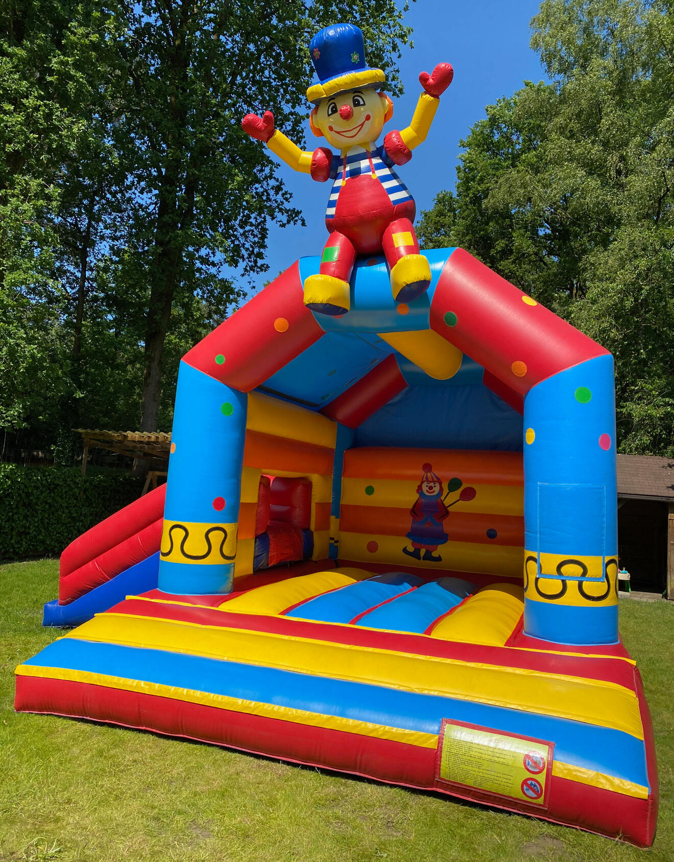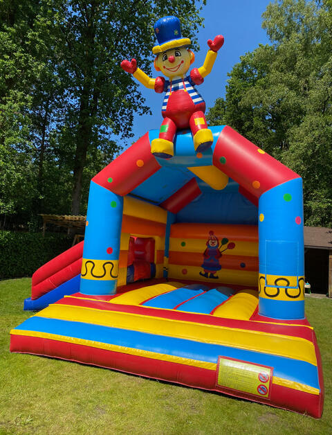 Sapperdeflap !Het groot springkasteel met clownthema heeft kleurrijke, vrolijke decoraties met een opvallende clown op de top. Het biedt veel ruimte voor de kinderen om te springen en te spelen.