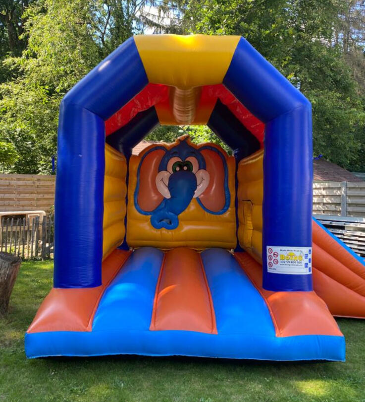 Trompetter van plezier !Dit vrolijk springkasteel heeft een aantrekkelijk ontwerp met zijn felle kleuren. Aan de zijkant bevindt zich een glijbaan , waardoor de kinderen op een leuke manier kunnen afdalen na het springen. Het biedt een geweldige manier om kinderen actief bezig te houden.