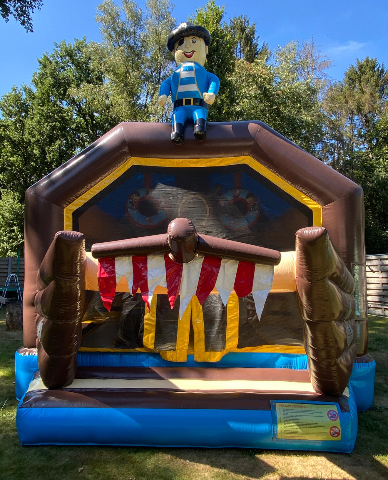 Schip ahoy !Het indrukwekkende grote springkasteel in de vorm van een piratenschip is een spectaculaire attractie voor kinderen van alle leeftijden. Met een opblaasbare buitenkant die eruitziet als een levensecht piratenschip, zullen kinderen meteen enthousiast worden over het avontuur dat hen te wachten staat.Binnenin bevindt zich een opwindende wereld van plezier en verbeelding. Kinderen kunnen deelnemen aan een piratenavontuur waarbij ze kunnen schieten met ballen naar doelwitten met behulp van de 2 kanonnen. Dit voegt een speelse interactieve dimensie toe aan het springkasteel.