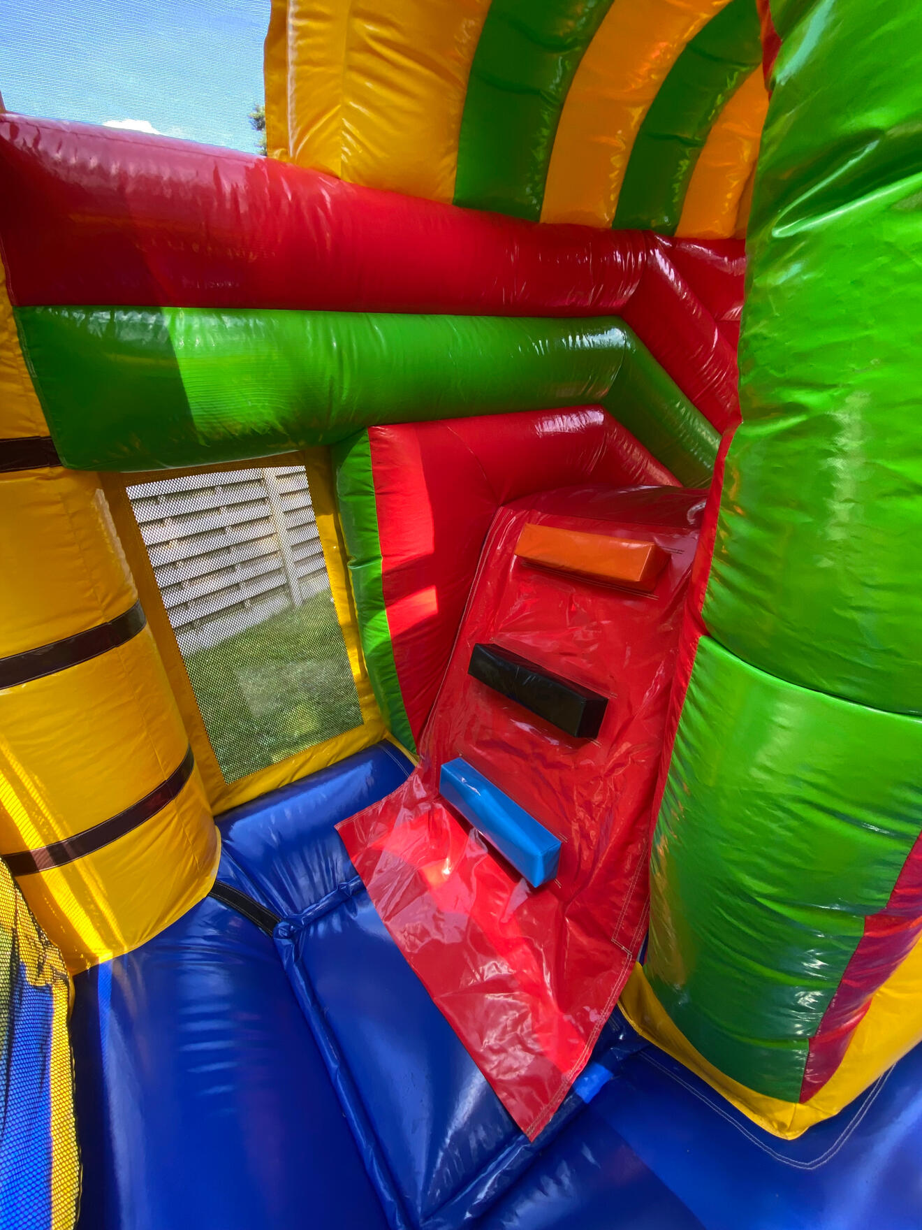 Het springkasteel is ook voorzien van een glijbaan aan de voorkant, waardoor kinderen niet alleen kunnen springen maar ook kunnen glijden.