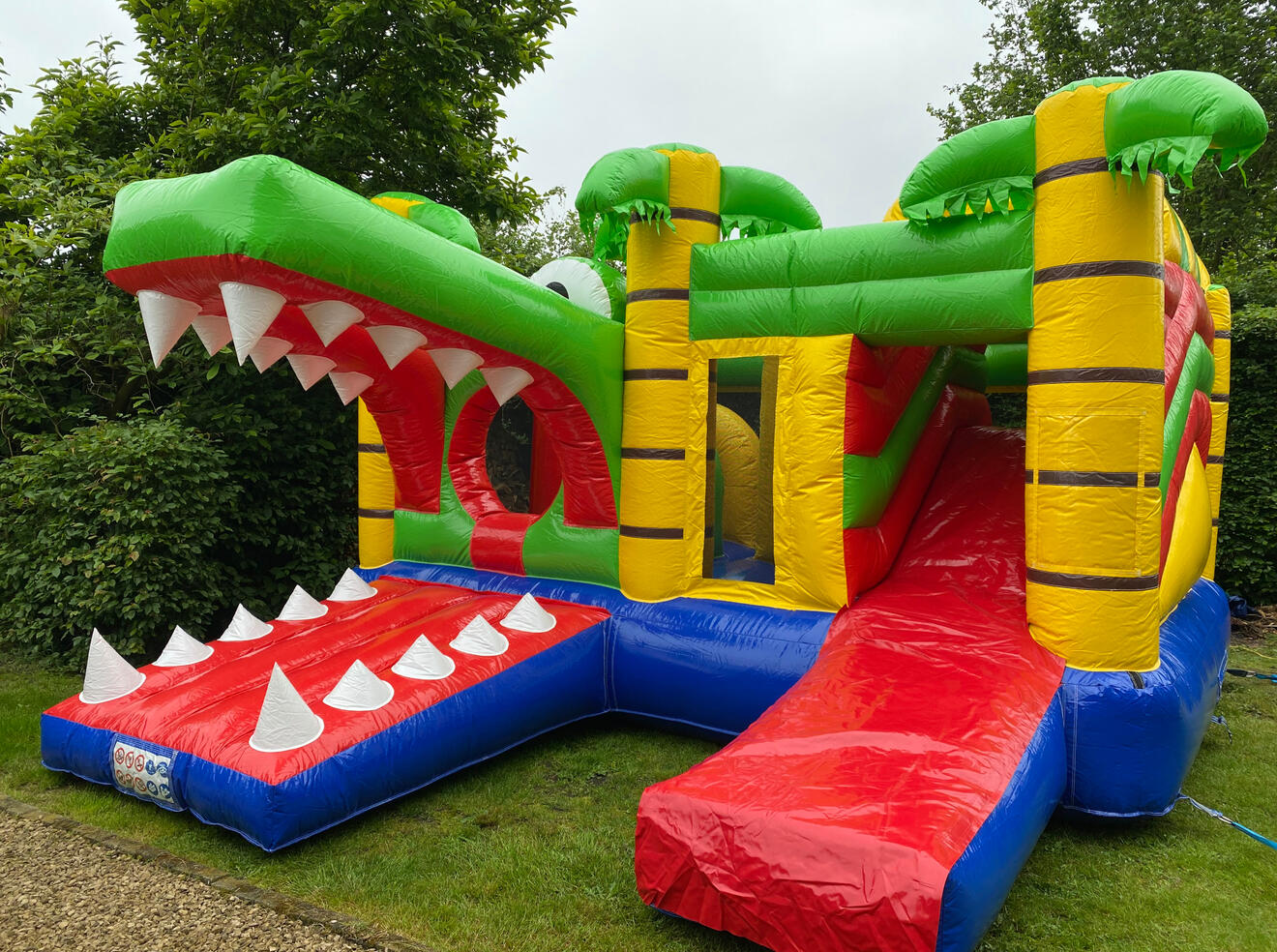 maar plezier bijt niet !Dit springkasteel is ontworpen in de vorm van een kleurrijke krokodil, wat zorgt voor een spannend en aantrekkelijk speelterrein voor kinderen.Wie durft het aan om in de bek te gaan kijken van deze krokodil?